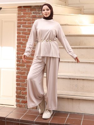 Vav Taş Rengi Yırtmaçlı Bluz Pantolontakım