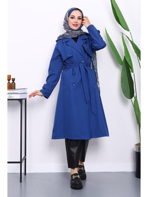 İmaj Butik Saks Mavi Kravuze Yaka Bel Kemerli Düğmeli Trençkot