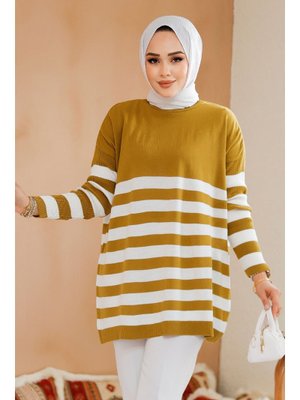 Neva Style Şerit Çizgili Yağ Yeşili Triko Kazak Tunik 5325yy