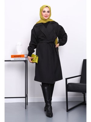 İmaj Butik Siyah Kruvaze Yaka Kuşaklı Trençkot