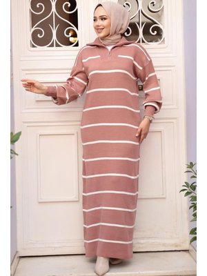 Neva Style Çizgili Gül Kurusu Triko Elbise 17206gk