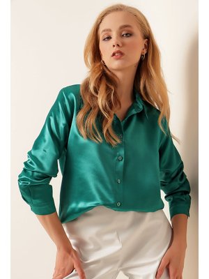 Bigdart Koyu Yeşill Hafif Dökümlü Saten Gömlek