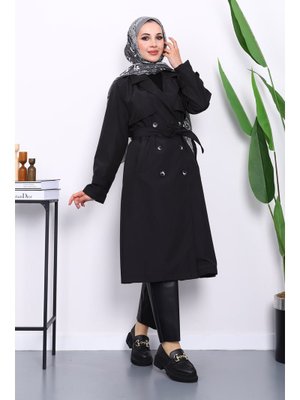 İmaj Butik Siyah Kravuze Yaka Bel Kemerli Düğmeli Trençkot