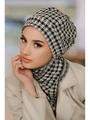 AİŞE TESETTÜR Siyah Beyaz Ekose Bere Ve Etol Takım