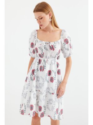 Bigdart Ekru Desenli Mini Kloş Elbise
