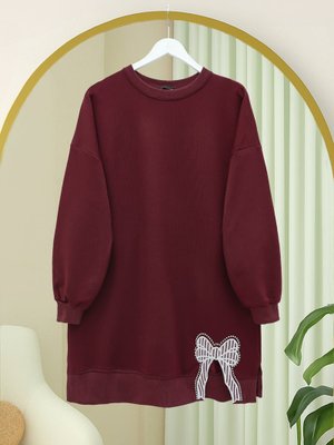 Podyumplus Bordo Yuvarlak Yaka Eteği Fiyonk Detaylı Salaş Penye Tunik