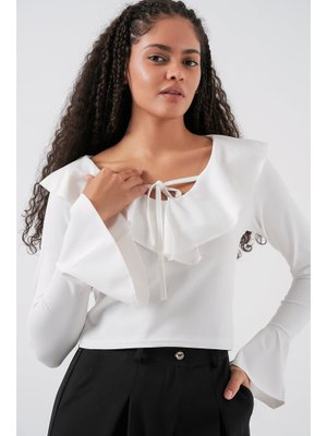 Bigdart Beyaz Uzun Kol Crop Bluz