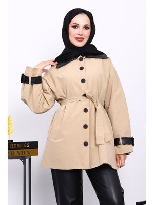 İmaj Butik Bej Deri Detaylı Kuşaklı Trençkot