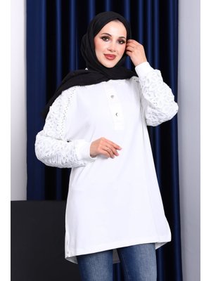 İmaj Butik Ekru Taş İşlemeli Düğmeli Tunik
