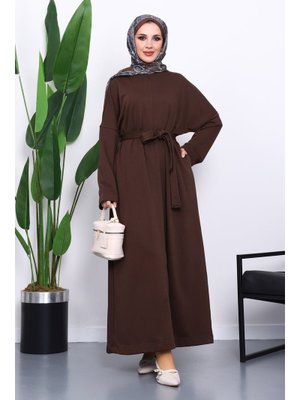 İmaj Butik Kahverengi Kuşaklı Üç İplik Elbise