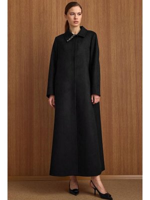 Olcay Siyah Devrik Yaka Taş Detaylı Süet Görünümlü Büyük Beden Pardesü
