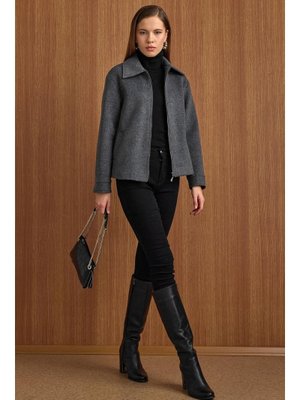 Olcay Koyu Gri Fermuar Kapamalı Oversize Kısa Kaban