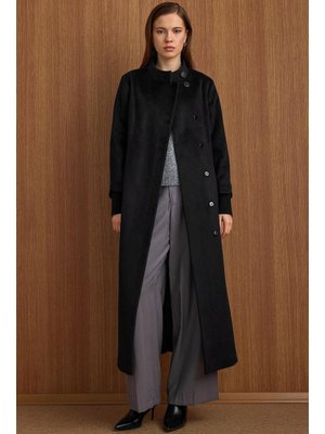 Olcay Siyah Hakim Yaka Ribana Detaylı Uzun Moher Kaban