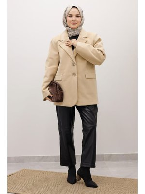Tesettür Dünyası Bej Çift Düğmeli Alpaka Fox Ceket