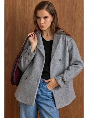 Olcay Açık Gri Pelerin Ve Kol Patı Detaylı Kruvaze Kısa Kaban