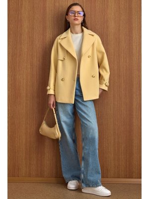 Olcay Sarı Pelerin Ve Kol Patı Detaylı Kruvaze Kısa Kaban