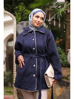 İmaj Butik Lacivert İnci Detaylı Taş Düğmeli Angora Kaban
