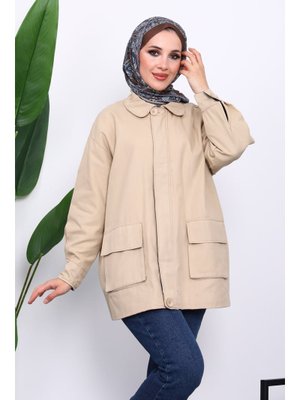 İmaj Butik Bej Cep Detaylı Fermuarlı Gabardin Ceket