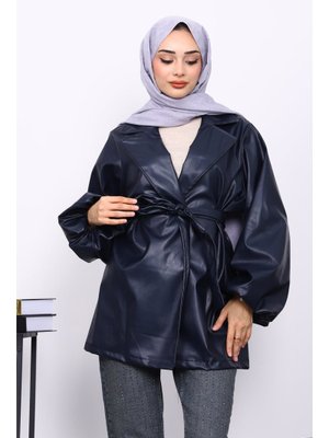 İmaj Butik Lacivert Balon Kol Kuşaklı Deri Ceket