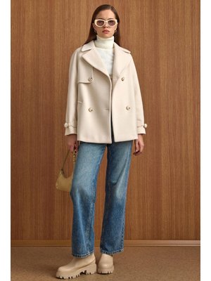Olcay Ekru Pelerin Ve Kol Patı Detaylı Kruvaze Kısa Kaban
