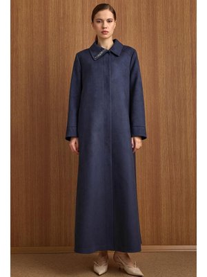 Olcay Lacivert Devrik Yaka Taş Detaylı Süet Görünümlü Büyük Beden Pardesü
