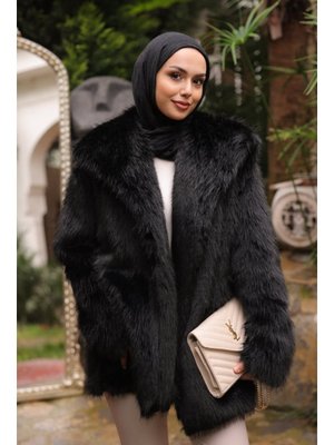 İmaj Butik Siyah Kemerli Astarlı Kürk Kaban