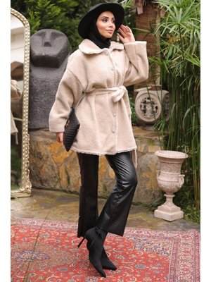 İmaj Butik Bej İnci Detaylı Taş Düğmeli Angora Kaban