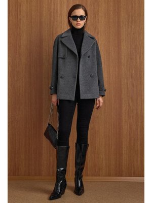 Olcay Koyu Gri Pelerin Ve Kol Patı Detaylı Kruvaze Kısa Kaban