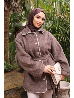 İmaj Butik Vizon İnci Detaylı Taş Düğmeli Angora Kaban
