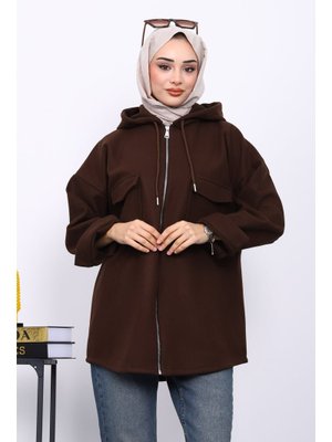 İmaj Butik Kahverengi Kapüşonlu Çift Cepli Kaşe Ceket