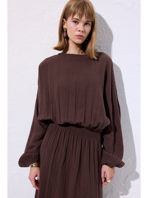 MANUKA Kahverengi Müslin Beli Büzgülü Elbise
