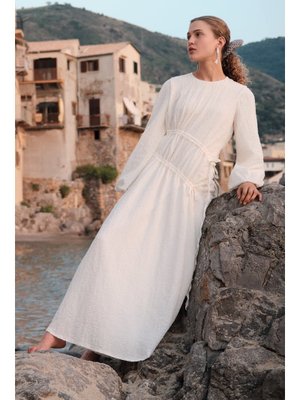 MANUKA Ekru Büzgü Bağlamalı Dokulu Elbise