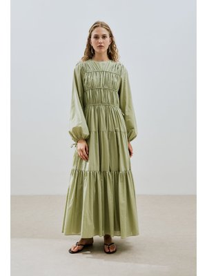 MANUKA Çağla Büzgülü Uzun Kol Elbise
