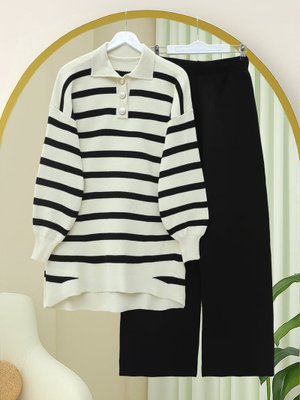 Podyumplus Siyah Polo Yaka Düğmeli Çizgili Triko Takım
