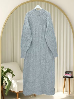 Podyumplus Gri Fitilli Yırtmaçlı Uzun Triko Elbise