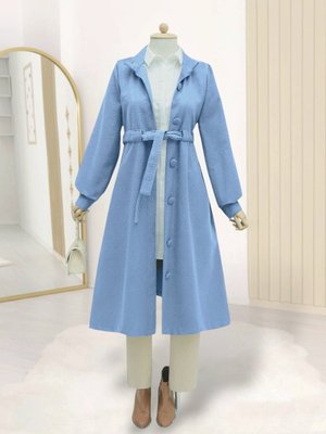 Podyumplus Mavi Belden Bağlamalı Top Düğmeli Kaşe Kaban