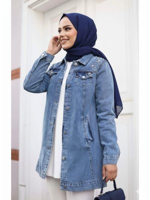 Harmatime butik Boncuk İşlemeli Denim Kot Mavi Ceket