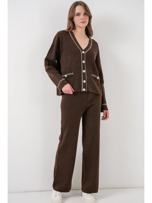 Bigdart Kahverengi Nakışlı Triko Hırka Pantolon İkili Takım