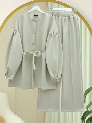 Podyumplus Bej Balon Kol Beli Kuşaklı Önü Düğmeli Scuba Takım
