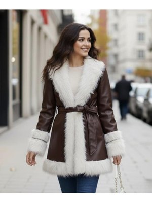 Harmatime butik Tüylü Kemerli İçi Astarlı Deri Kahverengi Ceket