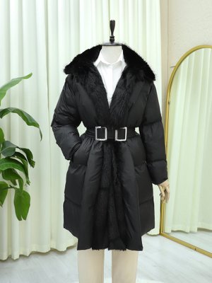 Podyumplus Siyah Kürk Detaylı Kemerli Cepli Şişme Mont