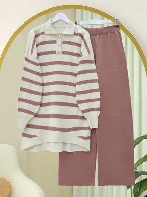 Podyumplus G.kurusu Polo Yaka Düğmeli Çizgili Triko Takım