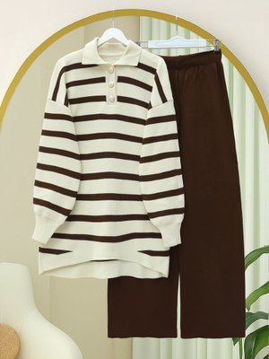 Podyumplus Kahve Polo Yaka Düğmeli Çizgili Triko Takım