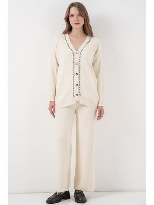 Bigdart Ekru Hırka Pantolon Triko İkili Takım