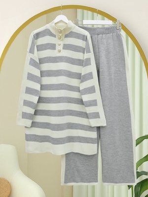 Podyumplus Gri Yarım Boğazlı Yakası Düğmeli Kalın Çizgili Triko Takım