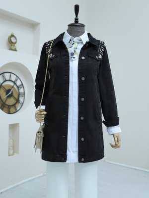 Podyumplus Siyah Taş İşlemeli Yıkamalı Kot ceket
