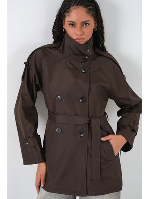 Bigdart Kahverengi Kruvaze Yaka Kısa Trençkot