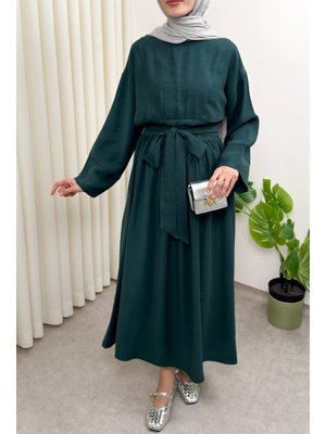 Salih Çelebi Zümrüt Yeşili Yüksek Bel Kuşak Bağlamalı Elbise
