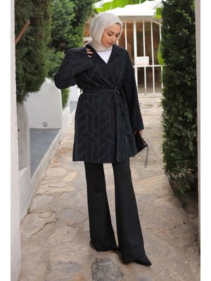 İmaj Butik Siyah Kapüşonlu Lazer Kesim Kot Ceket
