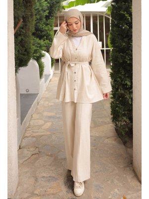 İmaj Butik Taş Bel Kuşaklı Keten Tunik Pantolonlu Takım